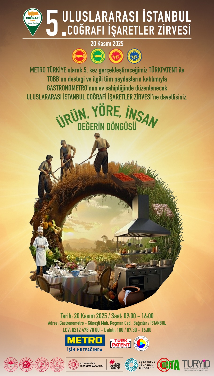 Metro Türkiye’nin ev sahipliği, Türk Patent ve Marka Kurumu ve Birliğimiz iş birliği ile 20 Kasım 2025 tarihinde İstanbul’da “Ürün, Yöre, İnsan: Değerin Döngüsü” ana temasıyla 5 Coğrafi İşaretler Zirvesi gerçekleştirilecektir.