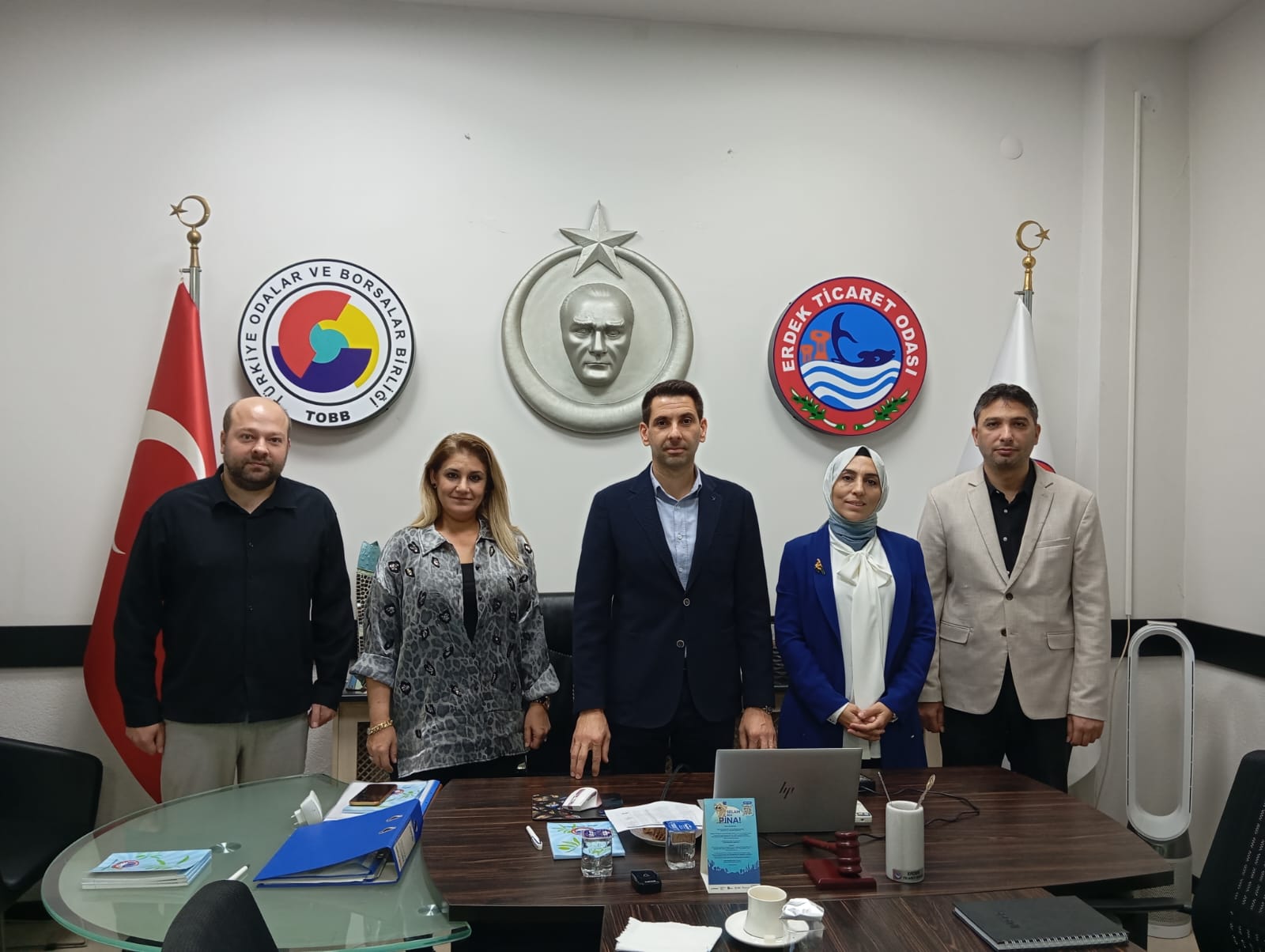 Heyet, Erdek Ticaret Odası Yönetim Kurulu Başkanı Hüseyin Uz, Kadın Girişimciler Kurulu Başkanı Çisem Tanrıöver Özhuy ve Genç Girişimciler Kurulu Başkanı Anıl Durak tarafından karşılandı.